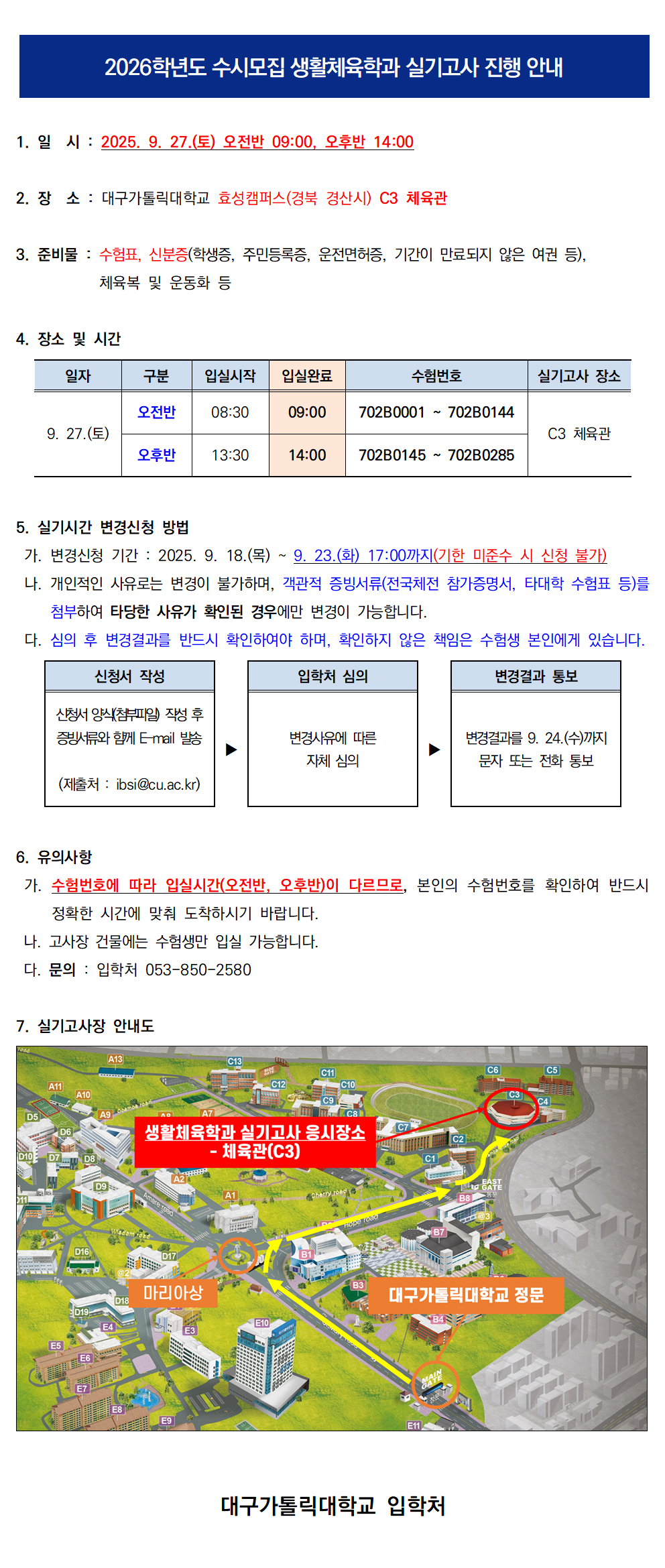 2026학년도 수시모집 생활체육학과 실기고사 진행 안내