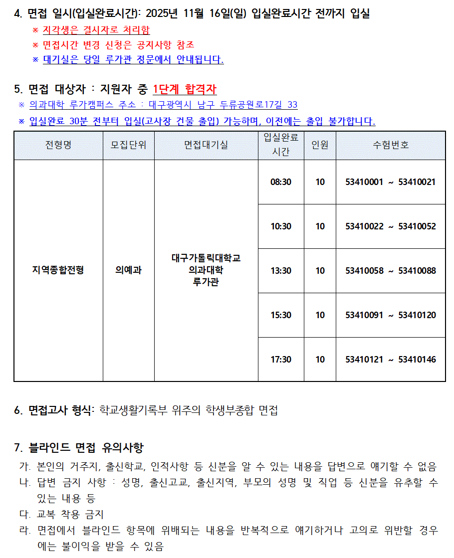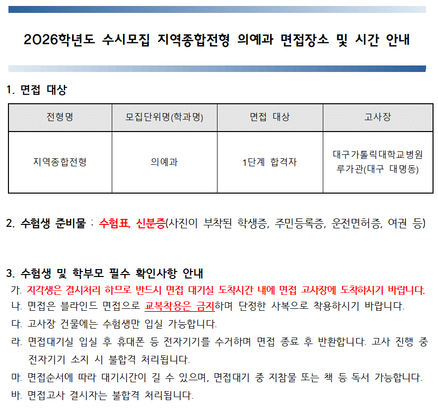 2026학년도 수시모집 의예과(지역종합전형) 1단계 합격자 조회 및 면접고사 진행 안내