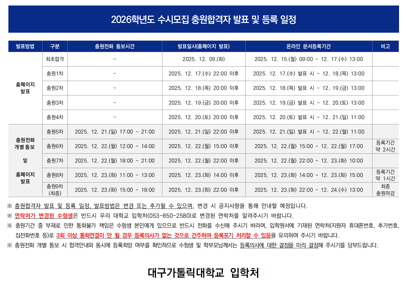 2026학년도 수시모집 충원합격자 발표 및 등록 일정 안내