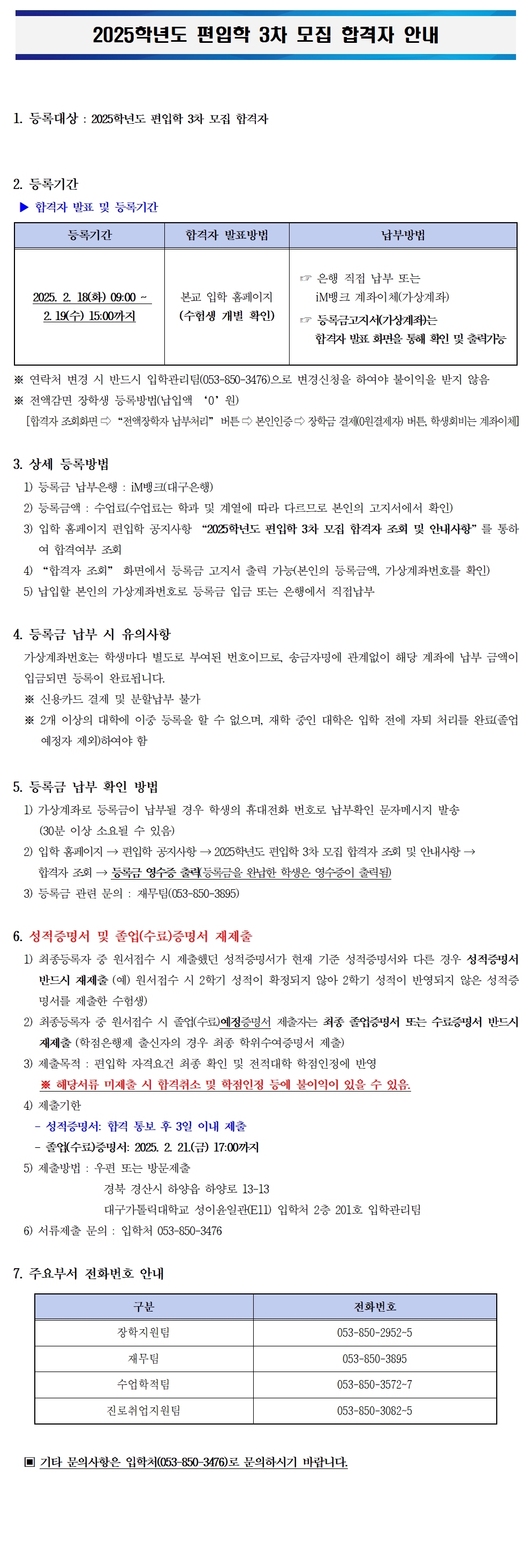 2025학년도 편입학 3차 모집 합격자 조회 및 안내사항